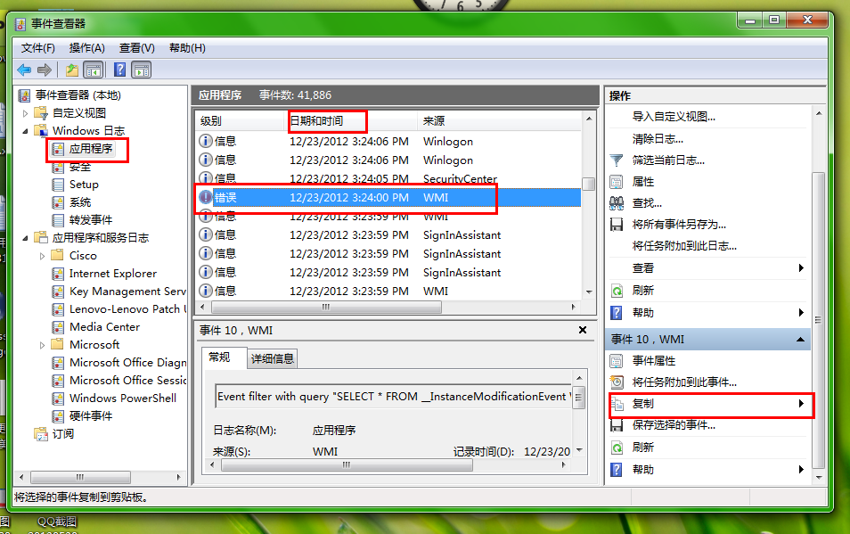 2.控制面板——管理工具——事件查看器——Windows日志——应用程序,在日志中选中一个事件的时候,右侧会有【复制】的选项。【复制】选项中点击【将详细信息复制为文本】,新建一个文本文档(可以在桌面右键新建),在记事本中右键粘贴或者快捷键Ctrl+V。